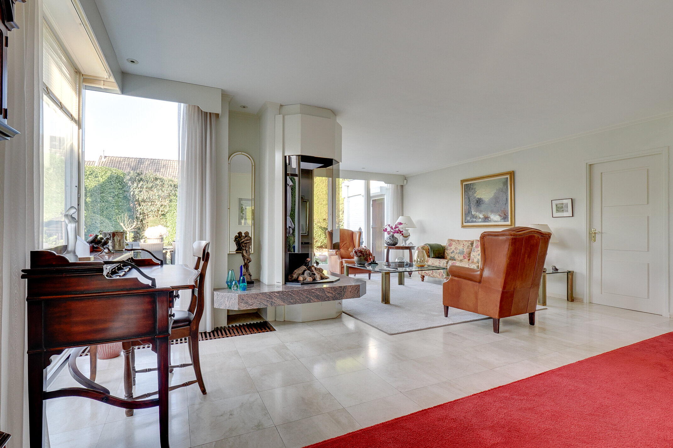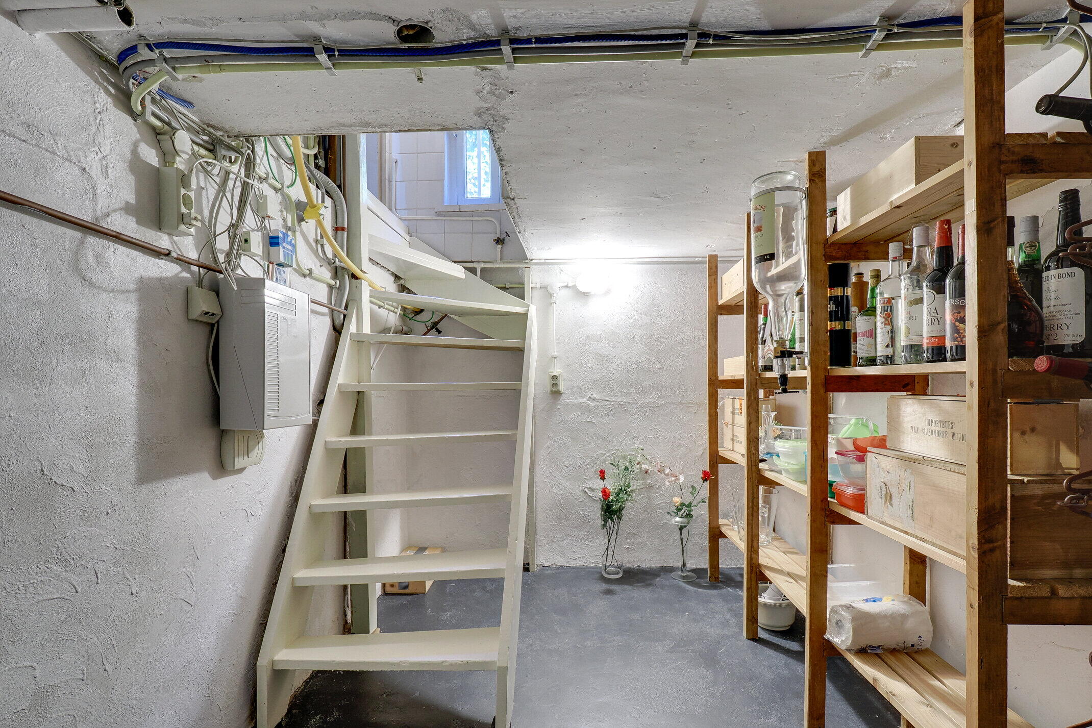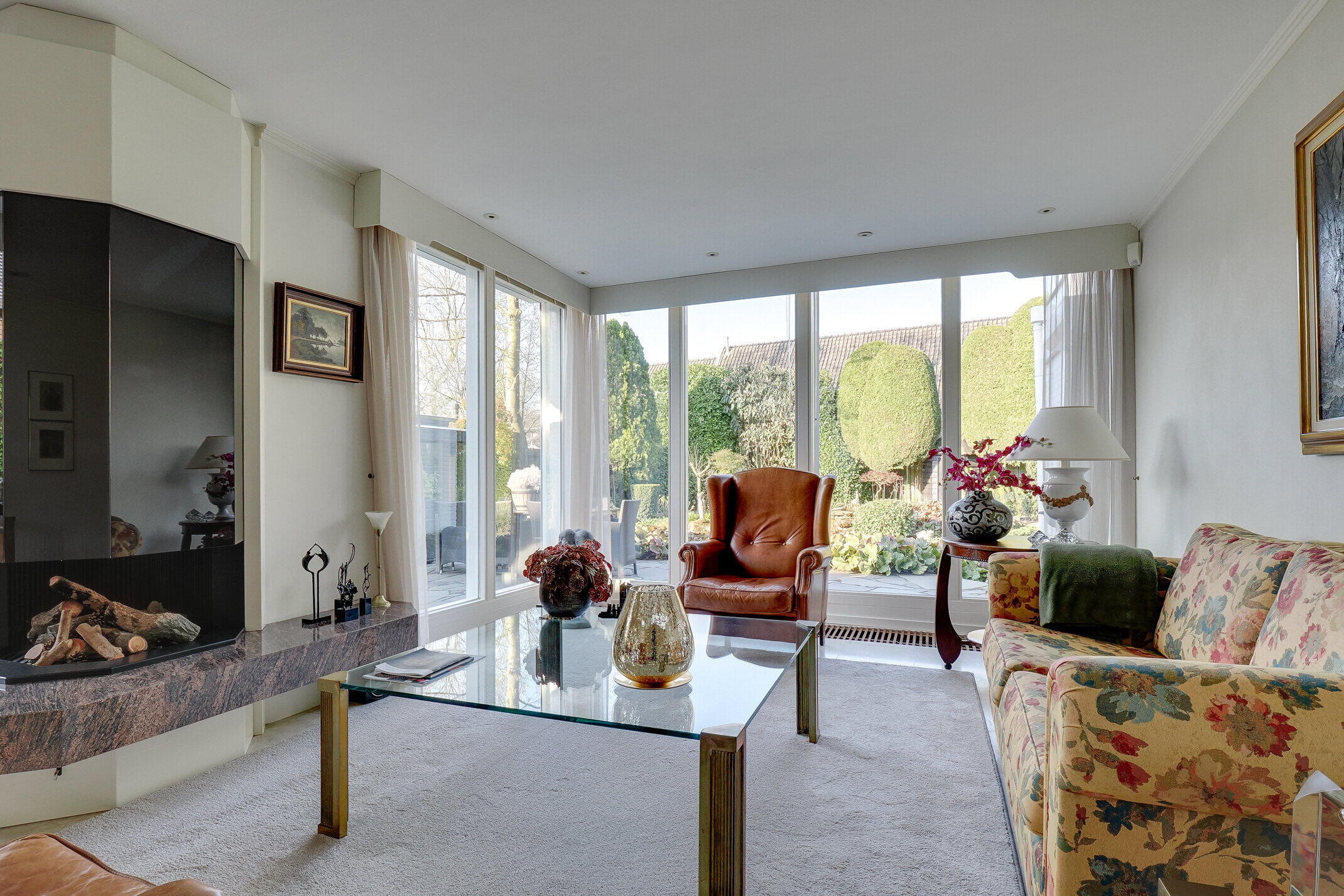 Upon entering, you are immediately struck by the warm, inviting atmosphere. The ground floor features a spacious hall with a separate toilet, a bright dining room with a cosy gas fireplace and a living room that flows seamlessly into it. At the rear is a library, adjacent to a practical utility room with the central heating system and direct access to the garden. The central kitchen is equipped with various built-in appliances and from here a fixed staircase leads to the basement, which with a height of approximately 1.70 metres is ideal as a wine cellar or storage space.