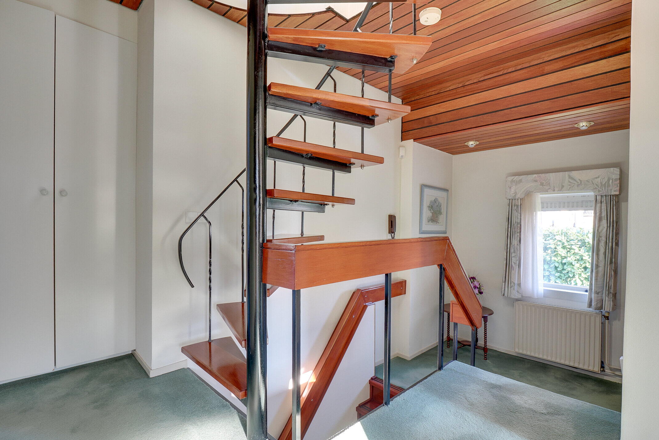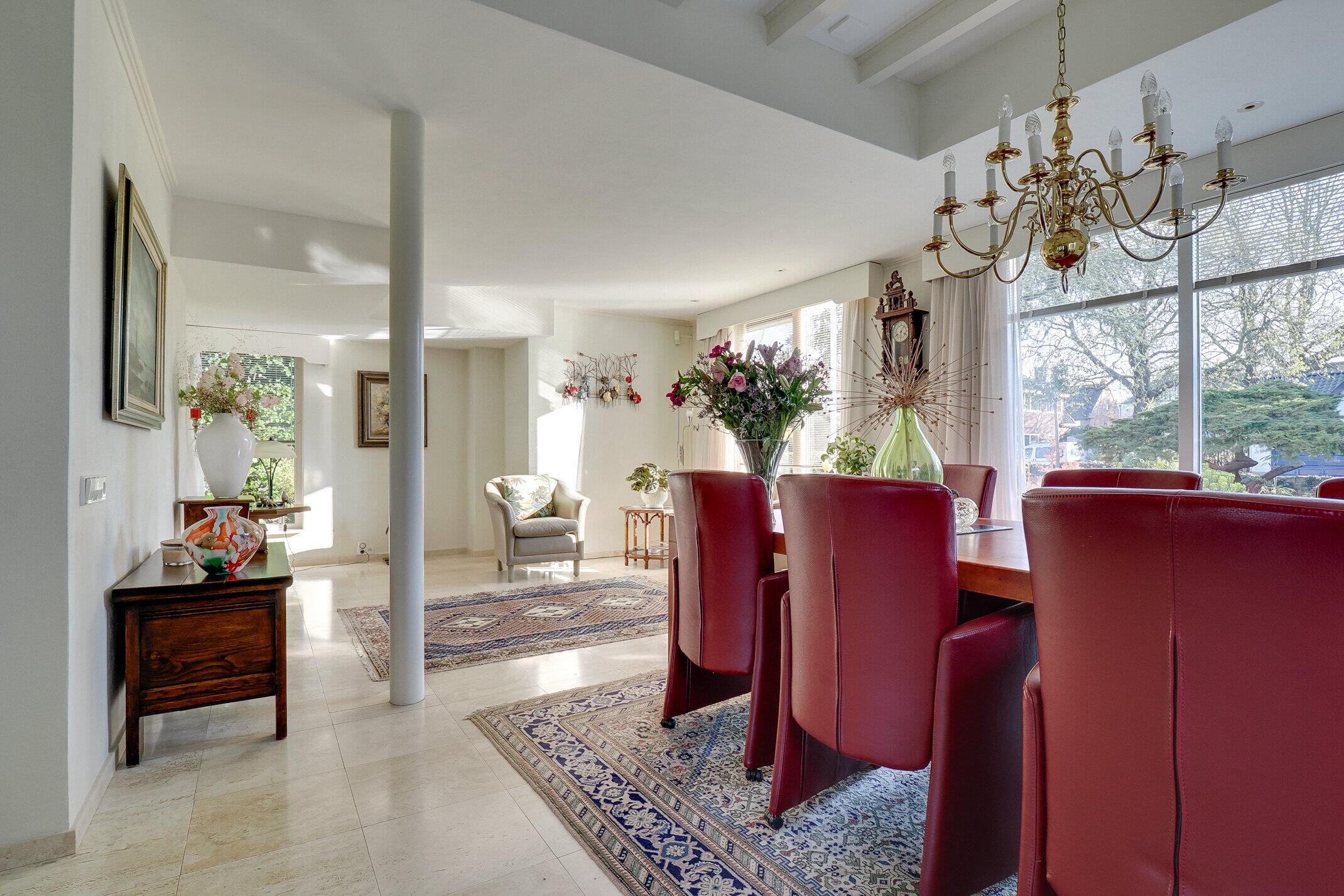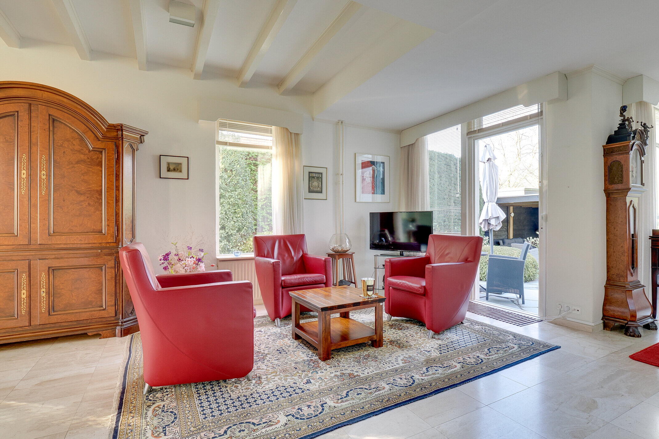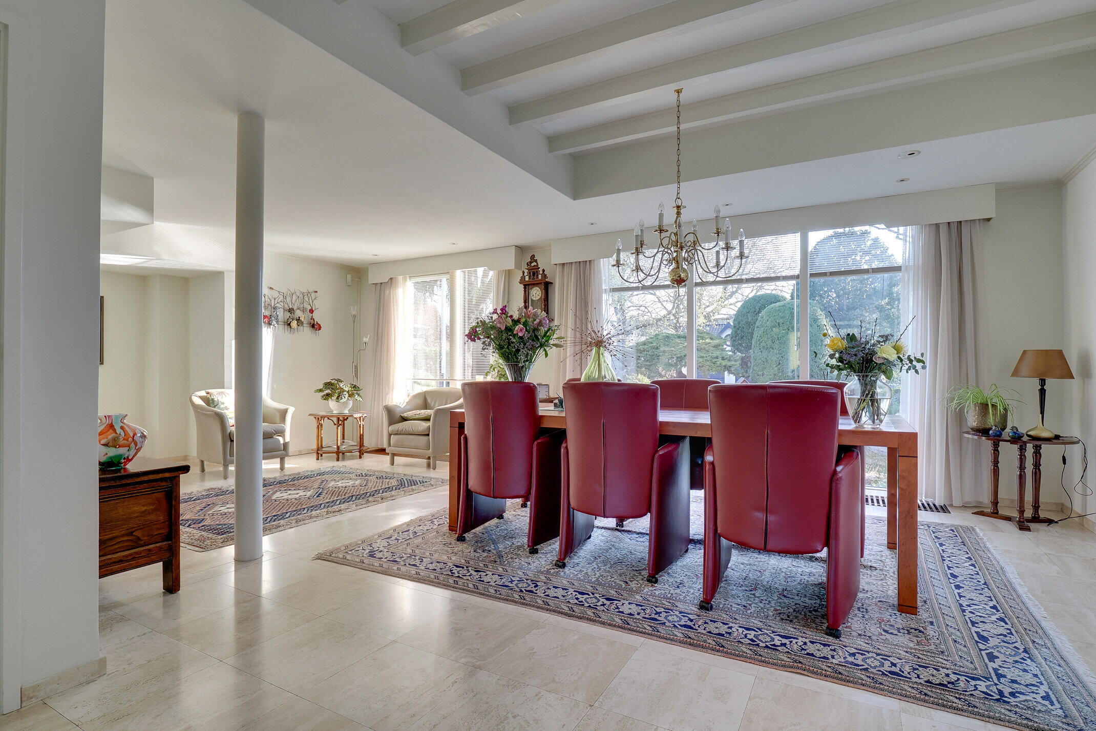 Upon entering, you are immediately struck by the warm, inviting atmosphere. The ground floor features a spacious hall with a separate toilet, a bright dining room with a cosy gas fireplace and a living room that flows seamlessly into it. At the rear is a library, adjacent to a practical utility room with the central heating system and direct access to the garden. The central kitchen is equipped with various built-in appliances and from here a fixed staircase leads to the basement, which with a height of approximately 1.70 metres is ideal as a wine cellar or storage space.